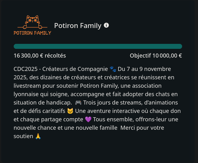 3 jours de lives, 33 créateurs de contenus tous réunis autour d'une même cause, des témoignages, des interviews, des rires, des larmes, des pétages de plomb, et surtout 16300€ de dons, cumulés à 799€ récoltés grâce aux préventes de t-shirts et sweat à l'effigie de la Potiron Family et du #CDC2025, bref si on compte bien, plus de 17000€ récoltés grâce à tout ça, et surtout, grâce à vous qui avez répondu présents, et pour ça nous vous remercions tous du fond du cœur !