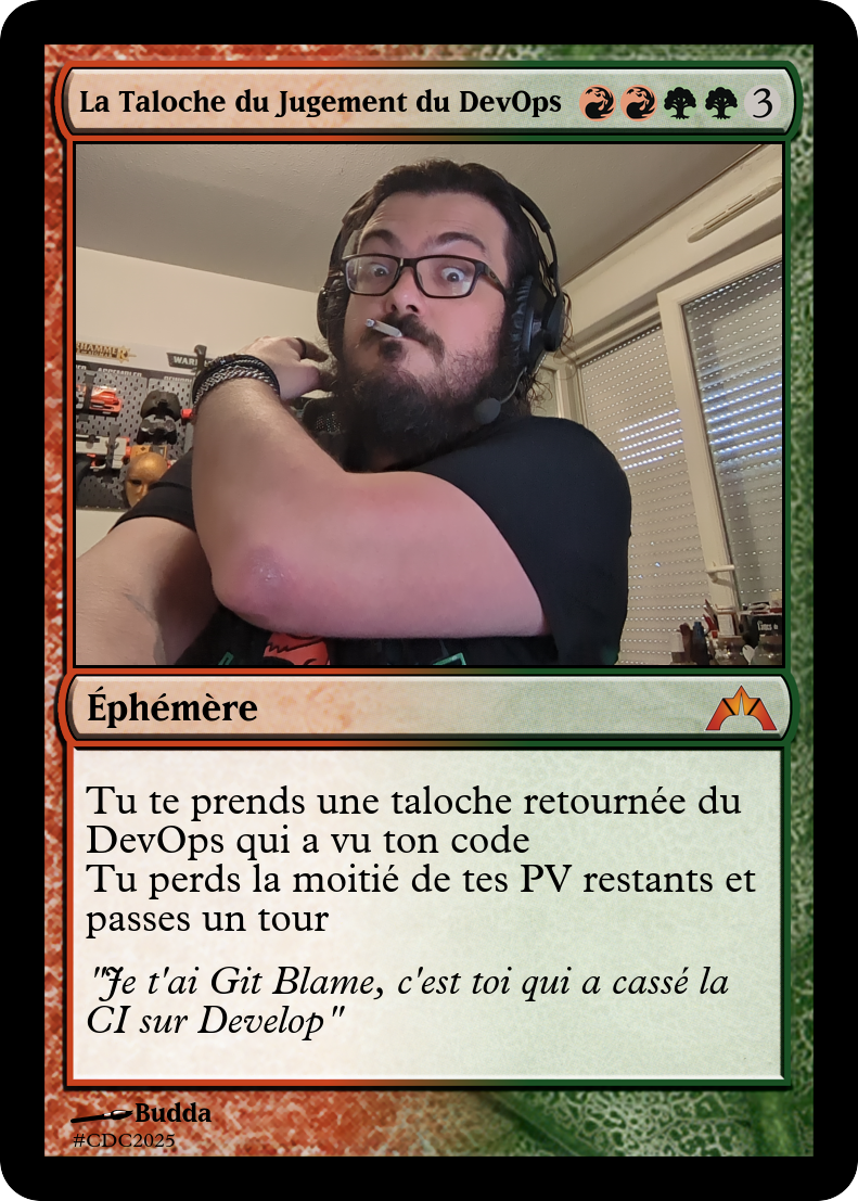 - Une carte Magic custom en référence à mon boulot hors création de contenu créée, avec forcément une ref à ce que je jouais quand j'étais moi même joueur de Magic (mon deck main était un Rouge-Vert)