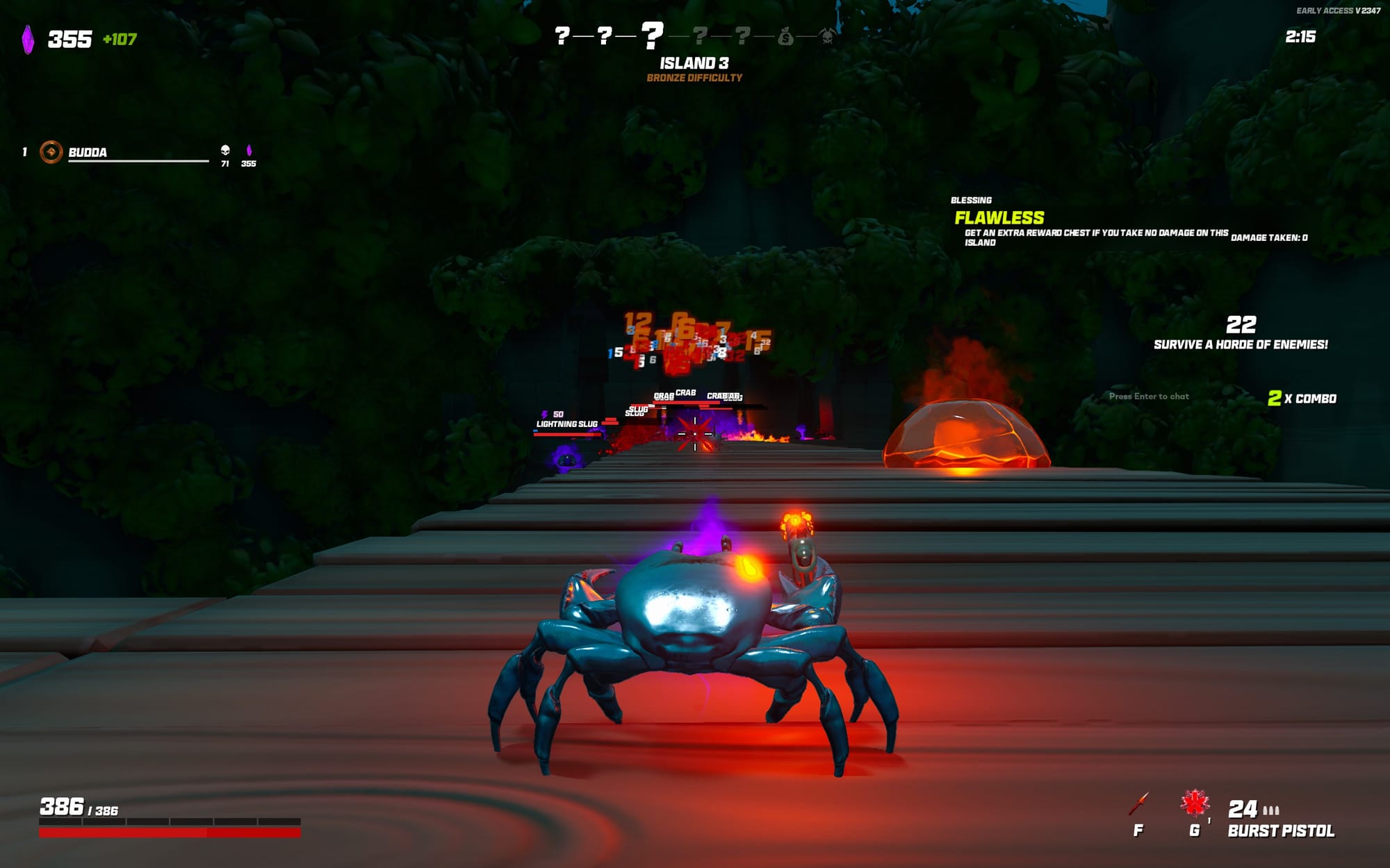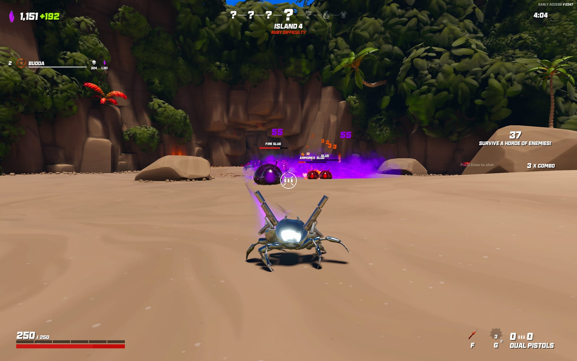 Ici pas d'histoire compliquée, on est direct plongé dans l'action, on joue un crabe avec un flingue, et on doit enchaîner les runs pour dézinguer d'autres crabes avec ou sans flingues, mais aussi des limaces explosives, des fourmis géantes et autres joyeusetés.