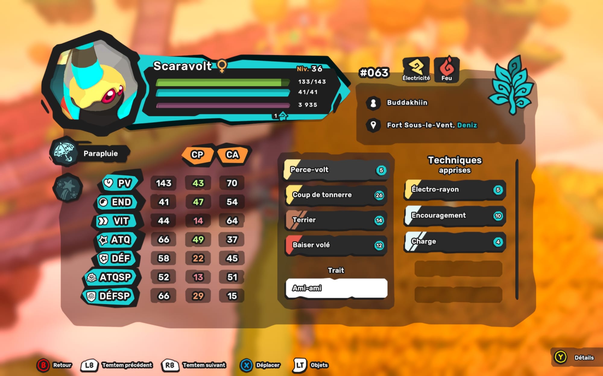 Quand vous zieuterez la fiche de votre Temtem directement dans votre équipe ou depuis un Temdeck (le PC), vous verrez en plus de la stat totale et des CP une troisième colonne, les CA, ou Caractéristiques Acquises (TV ou Training Values dans la langue de Sunset Neon), ce sont des stats que votre Temtem favori gagnera au fil des combats ou en lui donnant des fruits à manger.