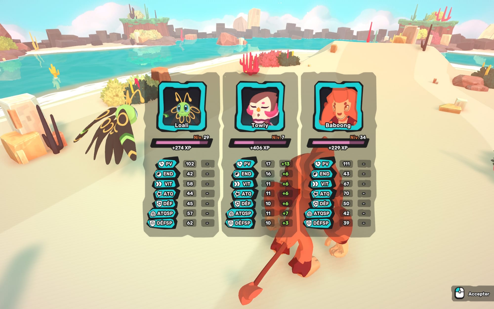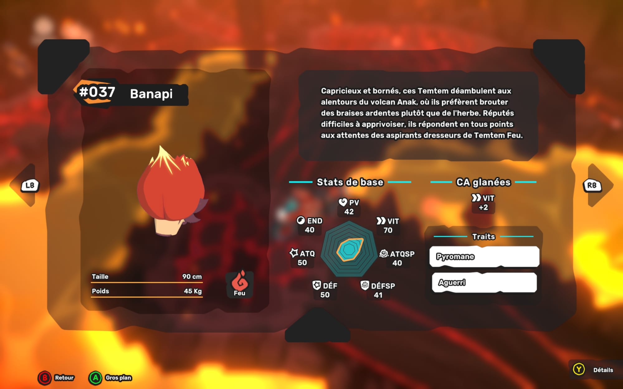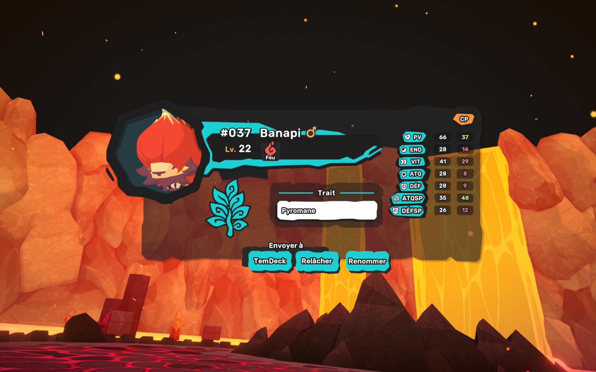 Voilà, vous savez à peu près tout ce qu'il faut savoir sur comment lire les stats de votre Temtem, et donc savez que si vous voulez un bon atout, il vaut mieux que ses CP soient vertes.