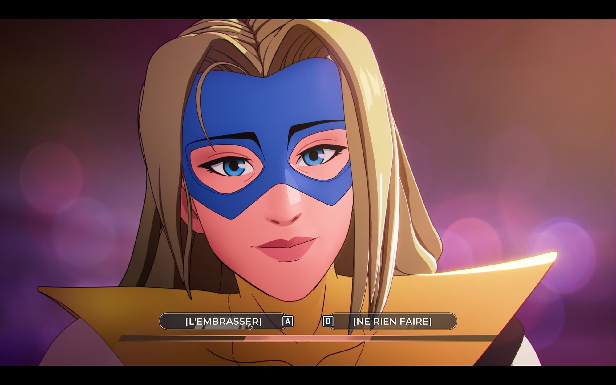 - premièrement les scènes interactives telles qu'on les connaît avec des studios comme Telltale notamment, où on regarde basiquement un dessin-animé interactif, avec des dialogues où on a plusieurs choix de réponse (je vous invite à jouer à la souris ou à la manette, les commandes étant en QWERTY et non remapables), saupoudrées de petits QTE à faire, bien qu'on puisse les retirer si jamais on a du mal avec cette mécanique dans ce genre de jeu (ce qui est mon cas)
