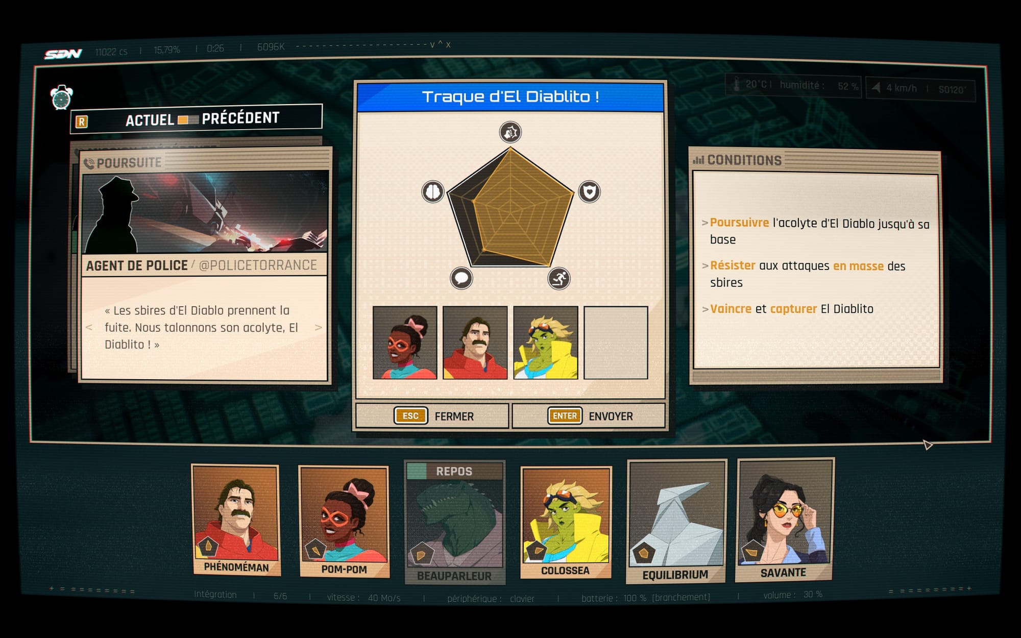- et ensuite, on a les phases de gameplay "pur", où on va gérer notre équipe de super-héros en répondant à des appels de détresse, un descriptif de la mission va nous être donné, et il ne tiendra qu'à nous d'envoyer les super-héros idéaux pour chaque situation, mais faîtes bien attention à vos effectifs, car ils ont besoin de repos après chaque mission, et une gestion minutieuse du timing des missions et de vos effectifs sera primordiale si vous ne souhaitez pas vous retrouver dans des situations délicates, le tout avec parfois des petites phases de piratage où on déplace un cube dans un circuit (entièrement faisable avec les flèches du clavier et heureusement) pour assister nos héros