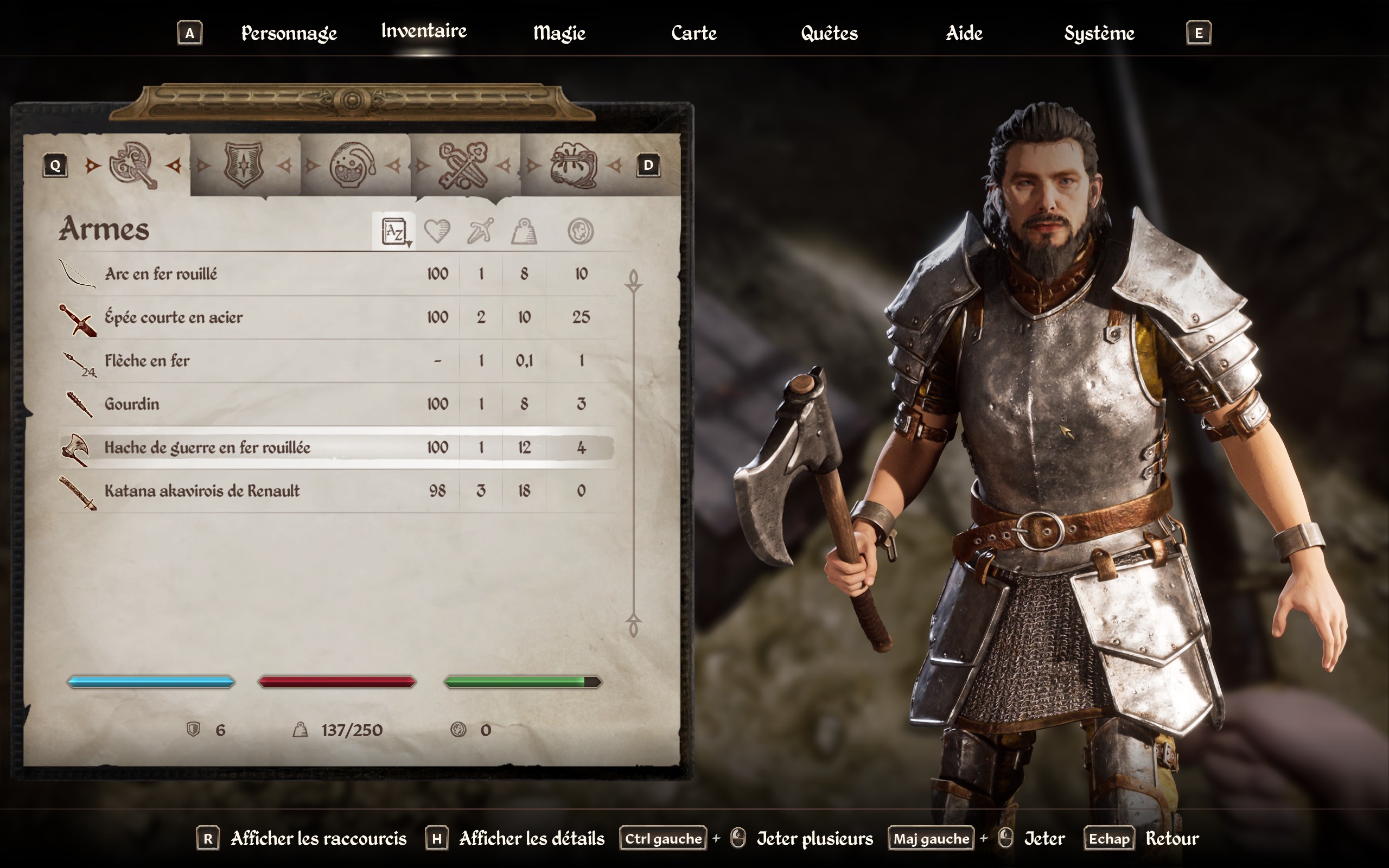 Du côté des menus et interfaces, parce que oui, vous allez beaucoup mettre le nez dedans, je vous rassure, ceux ci sont restés fidèles à l’époque, avec un petit lissage visuel qui les rendent très agréables à regarder, et me rappelle à quel point les menus de Skyrim étaient une véritable purge à utiliser quand on joue clavier souris (pas pour rien que ça a vite été moddé, et même à la manette je les trouvais pas pratiques sur Skyrim).