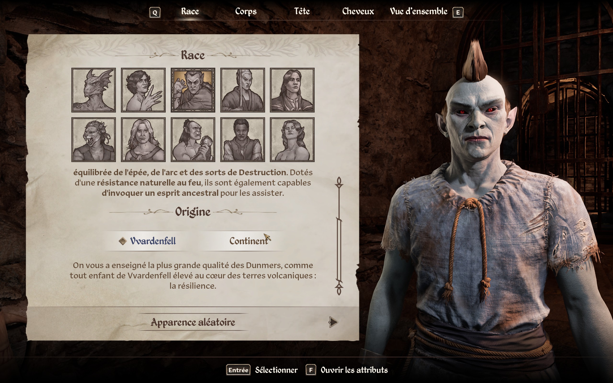 Comme dans son illustre aîné, on démarre en tant que simple prisonnier dans la prison de la Cité Impériale de Cyrodiil, mais dès la créa je note un changement mineur mais qui a son importance : en plus du choix de la race, on peut désormais également choisir le lieu d’origine de son personnage parmi deux, ce qui ajoute un petit texte si on veut se la jouer roleplay, et surtout des petites variations dans vos stats de départ (rien de transcendant, mais pour les optimisateurs fous ça a son importance).