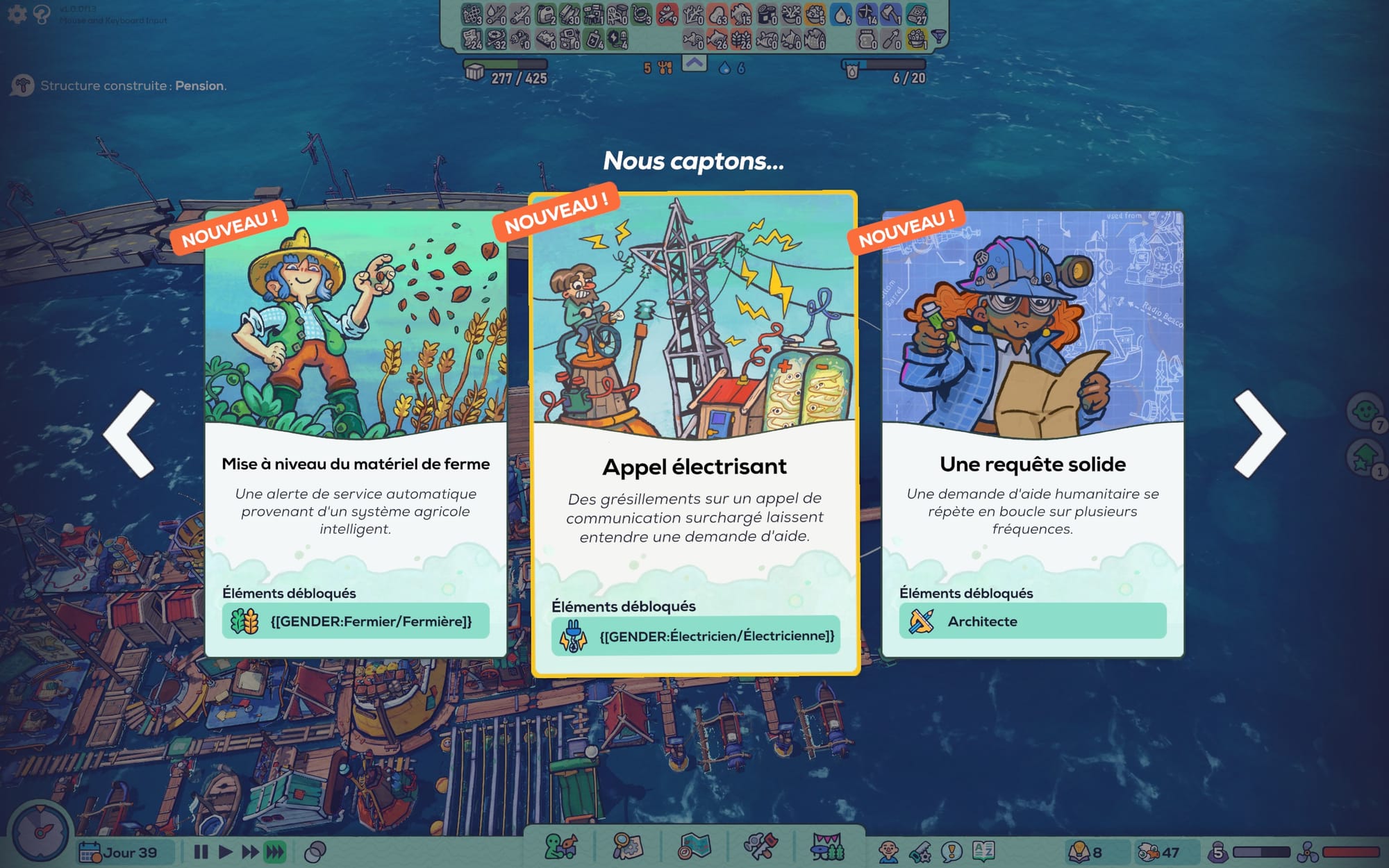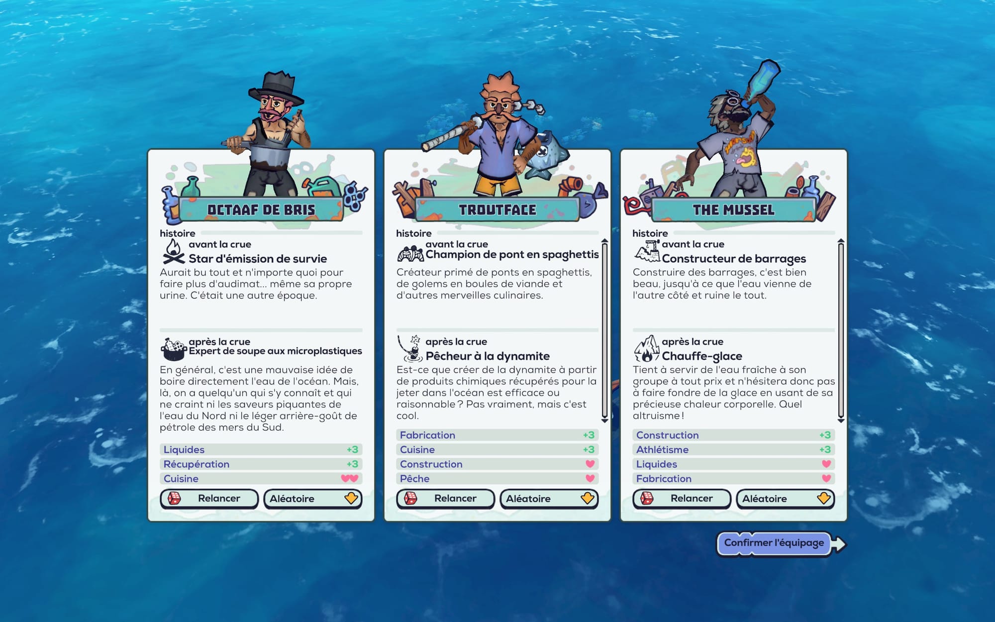 Dans la version d'origine, nous avions une espèce de phare flottant qui sert de cœur de ville, un peu à la manière du Générateur de Frostpunk, avec des naufragés génériques à son bord, tandis qu'aujourd'hui on a des personnages générés aléatoirement avec des statistiques définissant leurs compétences de départ, ainsi que les travaux qu'ils aiment faire aujourd'hui (oui ça joue sur le moral), le tout sur un navire avec des pontons qui en font le tour.