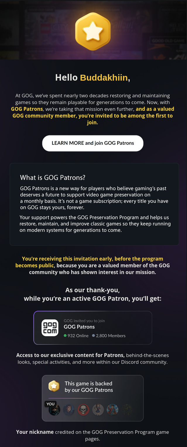 Il fut une époque lointaine où j'étais un gros client et gros défenseur de GOG, le store en ligne de jeux sans DRM, bon ça a changé depuis à cause d'un certain nombre de raisons, mais j'ai toujours un compte chez eux, et cette semaine j'ai reçu un petit mail que voici :