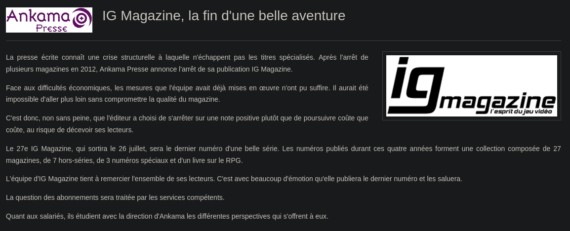 Sachez mes très chers lecteurs, que sans ce mook, ce site n'existerait peut être pas aujourd'hui, ou du moins pas dans sa forme actuelle, avec la plume que vous me connaissez, et je souhaite dire merci pour ces 4 années à toute l'équipe de feu IG Magazine, vous avez fait un travail formidable, et espère que vous avez pu continuer dans vos diverses activités après la fin de la publication de celui-ci.