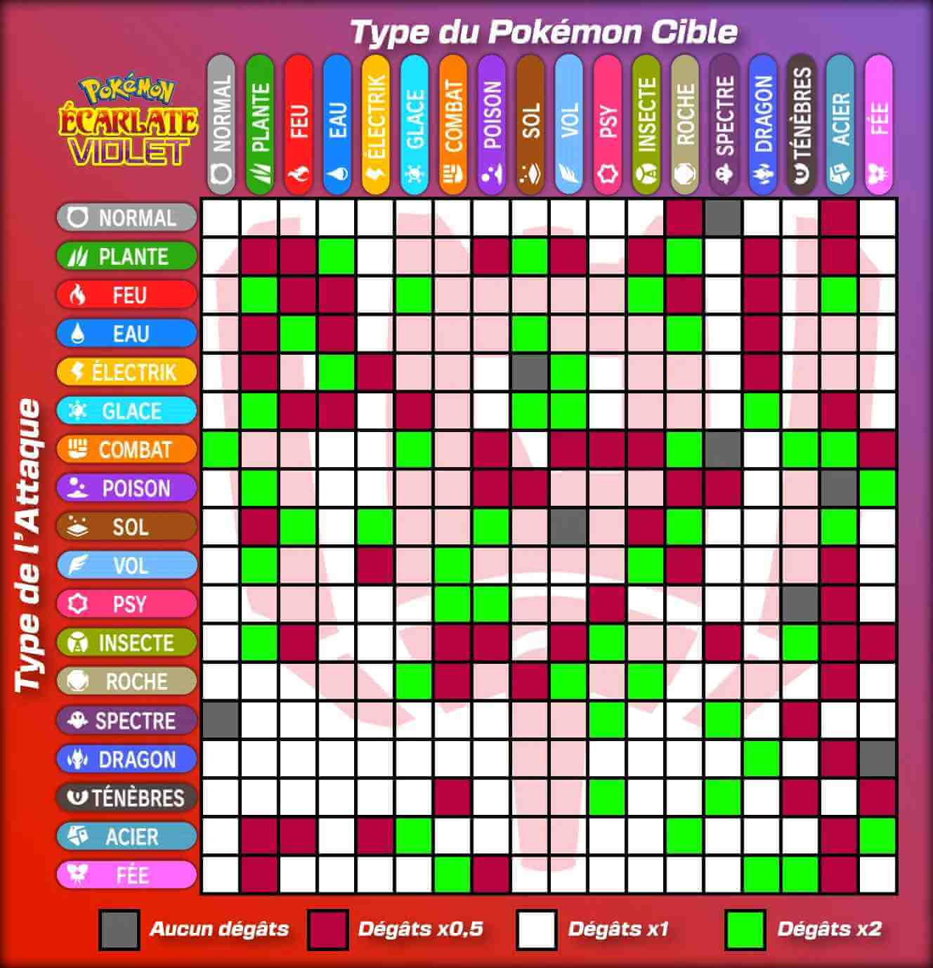 - Côté Pokémon, 18 types; les Pokemons seront très faibles, faibles, neutres, résistants, très résistants ou immunisés selon leur type/double type (exemple: un Type Normal sera faible au Combat mais immunisé au type Spectre. A contrario, un double type Normal/Ténèbres sera très faible au type Combat, vous voyez le genre...)