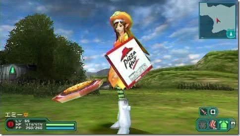 Allé un dernier exemple qui reste un de mes favoris, Phantasy Star est une licence de JRPG de Sega qui est considéré par de nombreux fans comme celle qui a inspiré de nombreuses scènes cultes dans les Final Fantasy (on peut penser à la mort de Nei dans le premier jeu de la série par exemple), et bien l'épisode Phantasy Star Portable 2 Infinity sur PSP contenait un set d'armure et d'armes complet Pizza Hut, et le Colonel Sanders de KFC était présent en tant que PNJ dans le jeu.