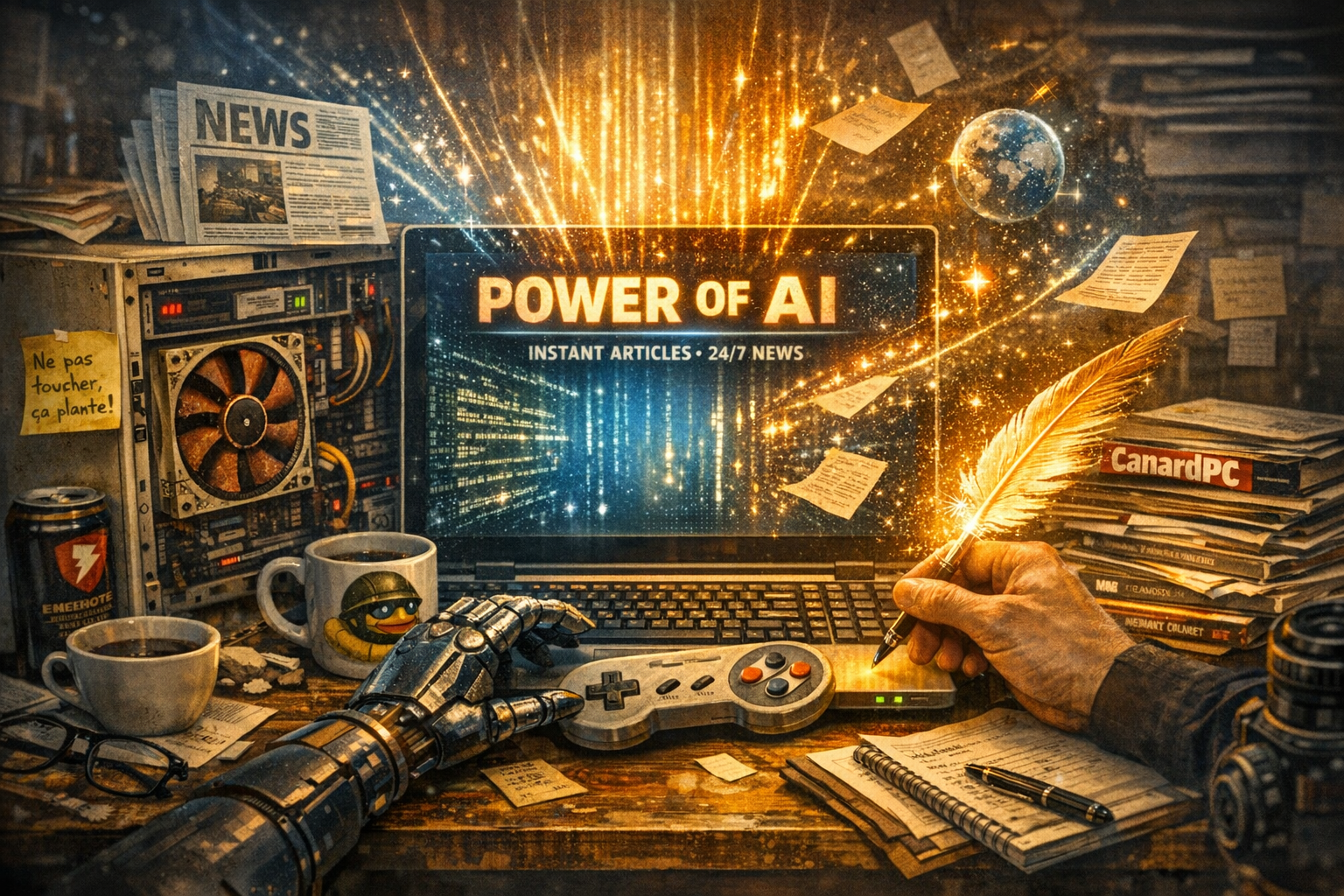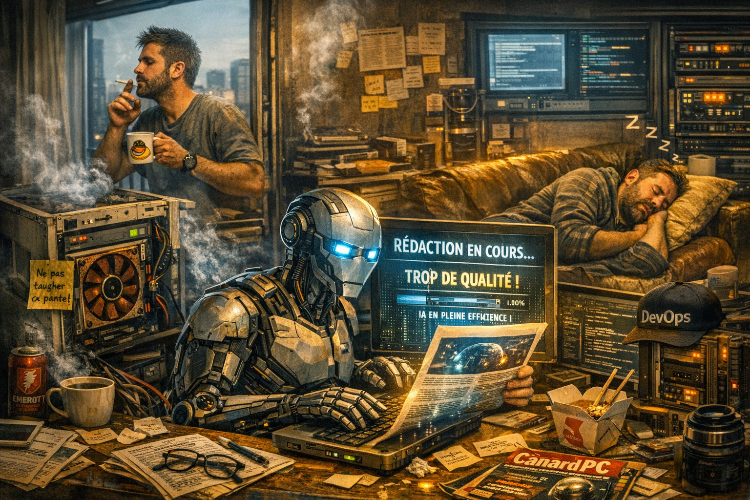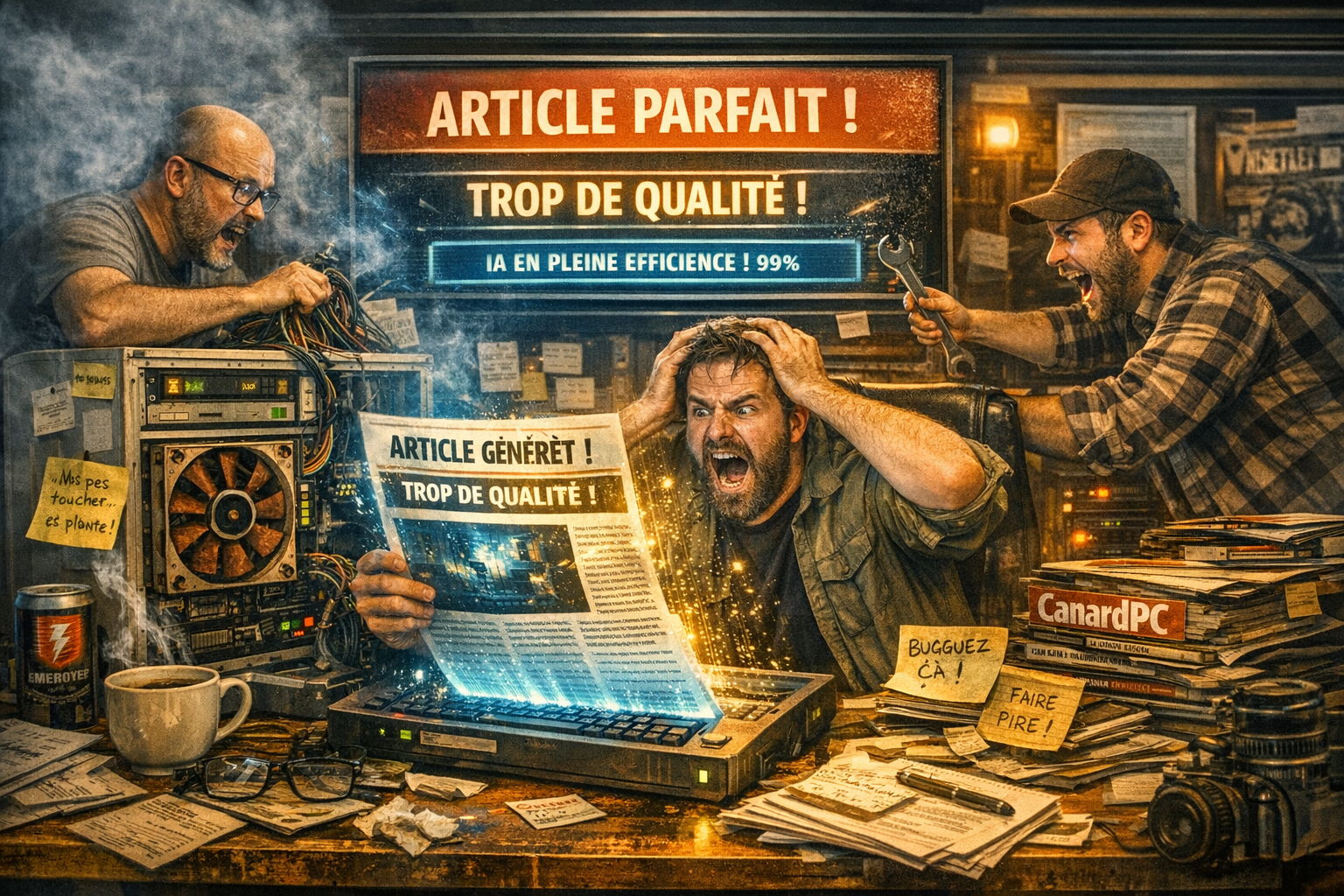 CanardPC, par exemple. Selon plusieurs sources internes (qui préfèrent rester anonymes, parce que bon, c’est CanardPC, ils aiment bien le mystère), ils auraient développé un modèle interne baptisé CanardGPT, qui tournerait sur une vieille tour sous Arch Linux, refroidie par un ventilo Noctua de 2012, planquée derrière la machine à café. Le modèle aurait été entraîné sur vingt ans de mauvaise foi journalistique, quinze ans de tests hardware où tout est “mal optimisé”, et l’intégralité des chroniques de Kahn Lusth. Résultat : il écrit des brouillons tellement crédibles que certains rédacteurs l’utilisent comme base sans même le dire. Un rédacteur m’a confié : “Franchement, il écrit comme moi, mais en plus rapide et en moins syndiqué.” Voilà. Tout est dit.