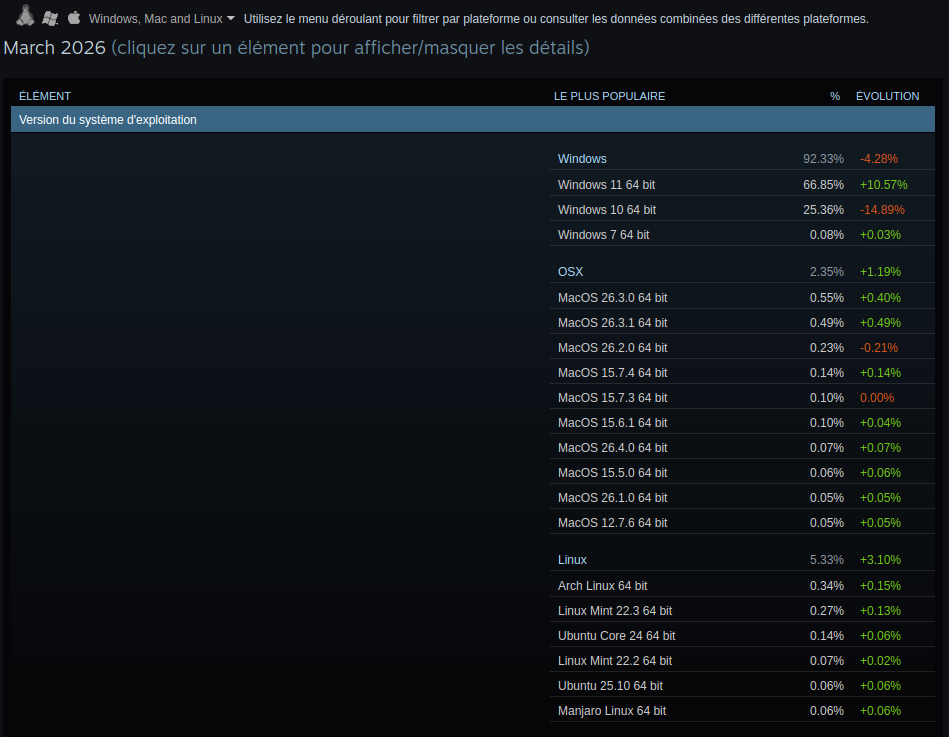 En scrollant sur Mastodon je suis tombé sur une statistique qui m'a actuellement mis sur le cul, car elle est en vérité historique, ça y est, Linux dépasse officiellement les 5% de parts de marché sur Steam.