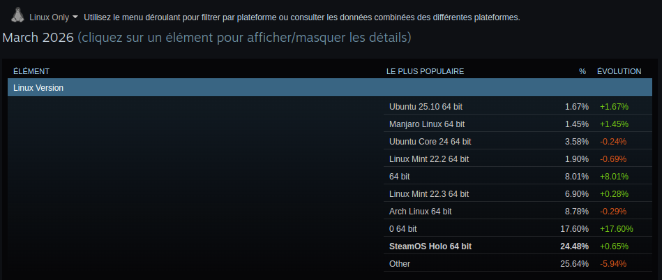 Et pourtant, Steam est dispo sur Linux depuis 2013, et côté amélioration de tout l'écosystème Gaming sur Linux avec Proton et compagnie, j'en ai parlé en 2018 quand Valve a sorti le Steam Play, qui permettait de jouer à des jeux Windows dans Steam, en 2021 avec une liste de jeux jouables nativement sur Linux dans un calendrier de l'Avent, ou la même année avec l'annonce de la Steam Deck, et plus récemment avec l'annonce de la Steam Machine V2, et depuis tout ce temps, bah oui, Linux est taillé pour le Gaming, et chaque année des évolutions techniques apportées à l'écosystème le prouvent, et cette statistique en est la preuve même.