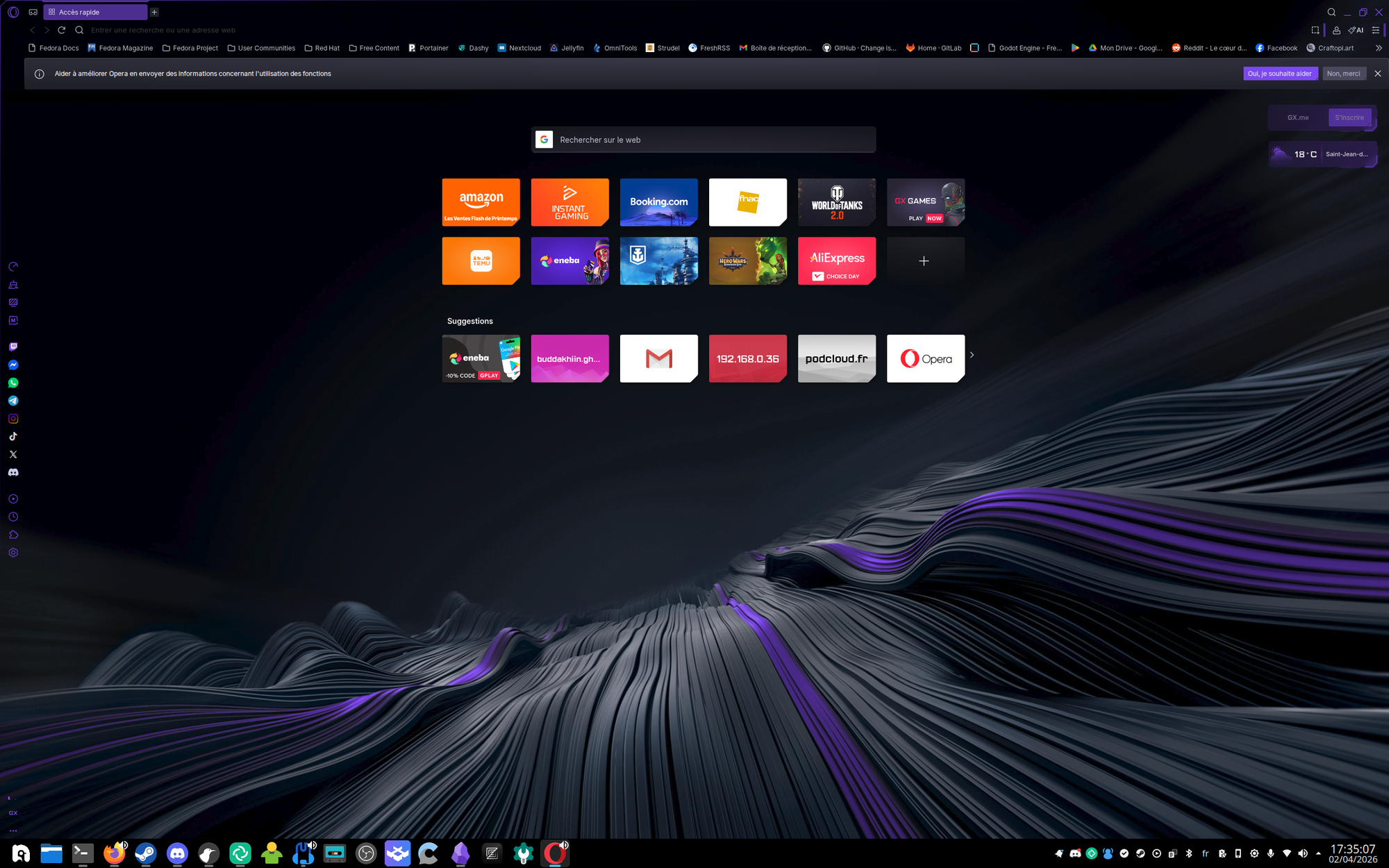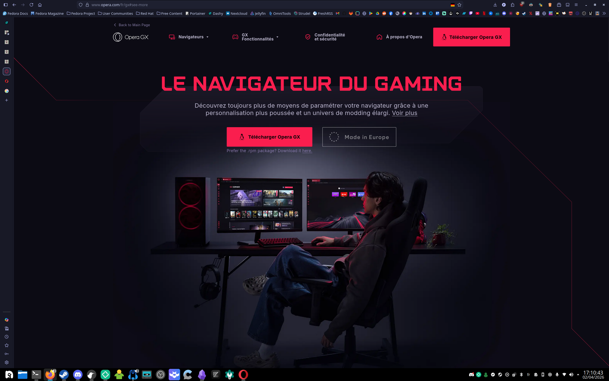 Mais il y a un premier couac, sur leur site quand on clique sur télécharger, ça télécharge direct un .deb, donc format Debian, or ma distribution, Nobara, est basée sur Fedora, donc il me faut un .rpm, jusque là rien de grave, ils ont juste fait la connerie de base des sites qui proposent du Linux sans connaître Linux et son écosystème (et encore, ceux qui sont sur Arch, ah bah ils vont se faire foutre, 0 indication de comment installer le navigateur, spoiler ya un AUR), mais en plus rien dans les dépôts officiels de ma distribution, mais heureusement il existe un guide pour ajouter Opera à ses dépôts pour Fedora et pour les distro basées sur Debian.