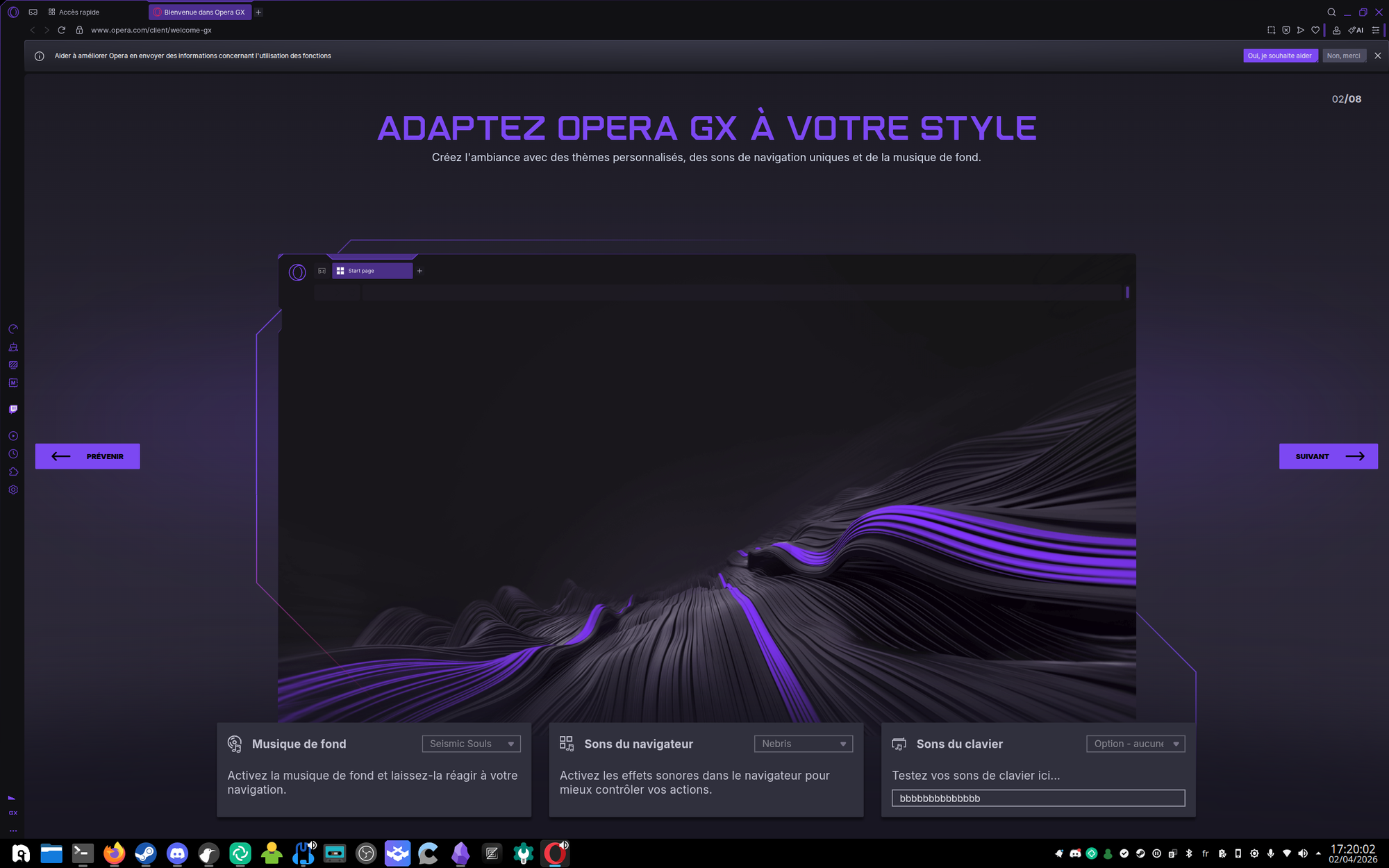 Donc premier lancement, d'abord on choisit son jeu de couleurs, vu que ma couleur préférée est le violet, j'ai pris celle la, ensuite on choisit les sons du navigateur, car ils proposent d'avoir des musiques de fond pour naviguer sur internet, mais aussi des petits bruitages à base de "zwouf" quand on interragit avec les boutons, et même des sons pour la frappe au clavier (genre si ton clavier mécanique à retour tactile fait pas assez de bruit comme ça), mais ça doit être pour donner une vibe un peu "Lofi" au bouzin (je conseille plus de jouer à Spirit City si vous voulez de la Lofi).