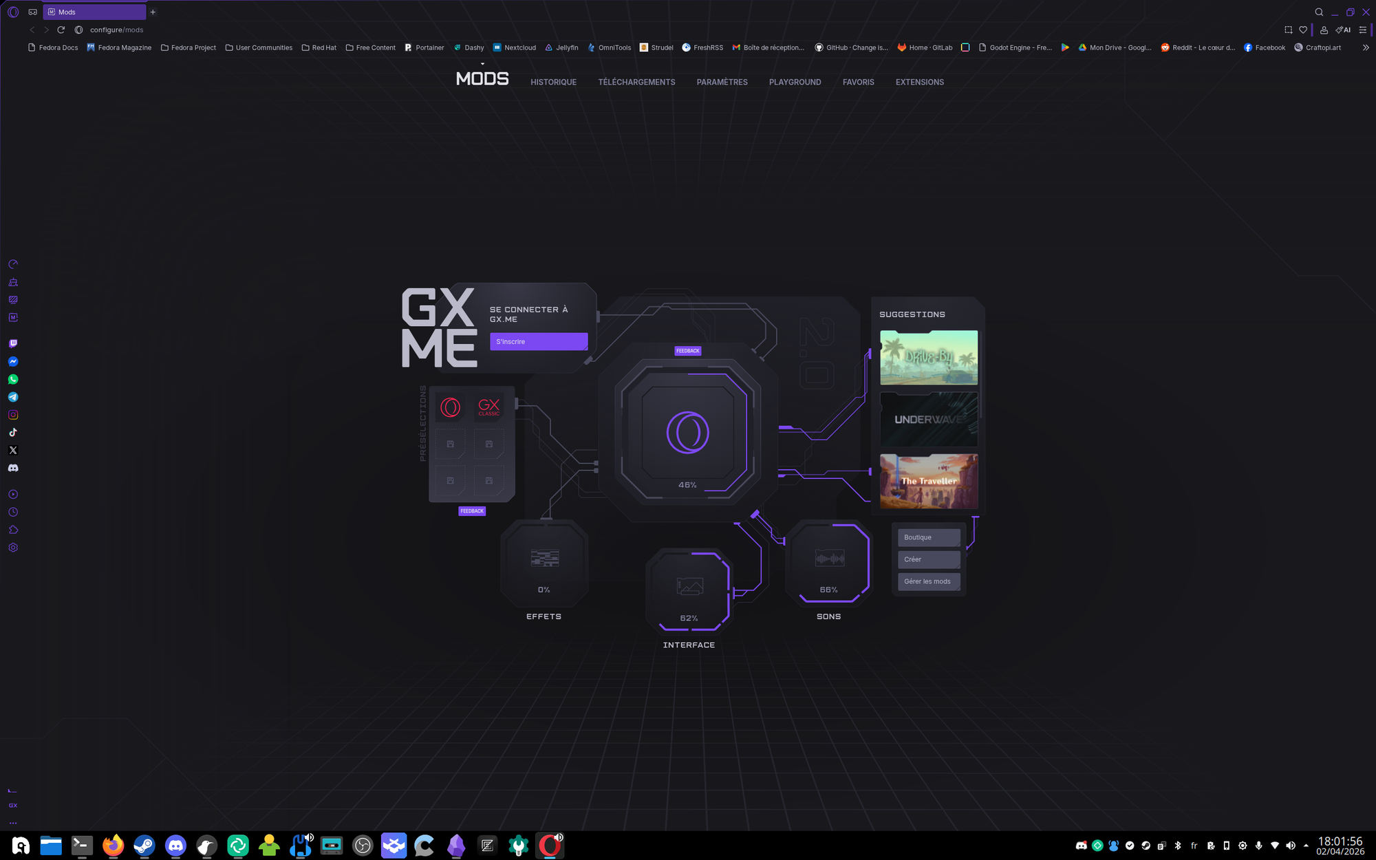 Les points les plus mis en avant pour Opera GX, en plus de son GX Corner, c'est sa customisation via un systèmes de "Mods" (oui parce que dire "Thèmes" et "Plugins" apparemment ça fait pas assez "G@m3rz", on a un petit hub qui ressemble à une UI de jeu Cyberpunk avec des Circuits de partout et un gros 2.0 caché derrière, car les "G@m3rz" ça veut que des trucs futuristes apparemment (nah en vrai c'est joli hein, mais pas giga pratique).