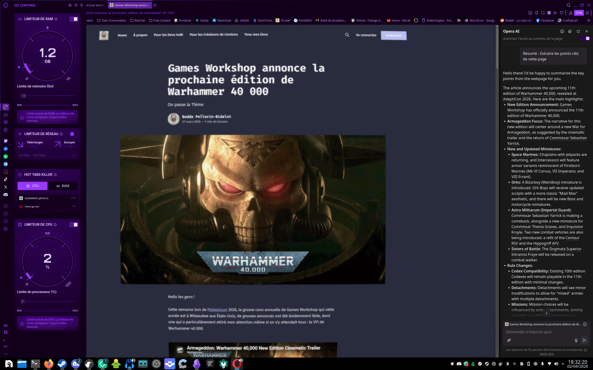 Passons au deux derniers points, Opera AI et GX Control, le premier est une IA Générative intégrée directement au sein du navigateur, connectée aux serveurs d'Opéra, malheusement j'ai pas d'infos sur le LLM utilisé, mais en termes d'usages elle reprend les mêmes fonctionnalités de base qu'un Chat-GPT, je ne serais donc pas surpris qu'elle soit basée sur un des LLM de OpenAI, bref aucune valeur ajoutée (et puis bon, je sais pas pourquoi, elle a décidé de se foutre en anglais sans raison chez moi).