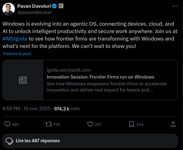 En effet, le 10 novembre 2025, Pavan Davuluri, Président de la division Windows chez nos chers amis de Microsoft, donc pas n'importe qui, a publié sur Twitter (tant que Elon Musk continuera de Deadname sa fille, je continuerai de Deadname son réseau social) le post suivant :