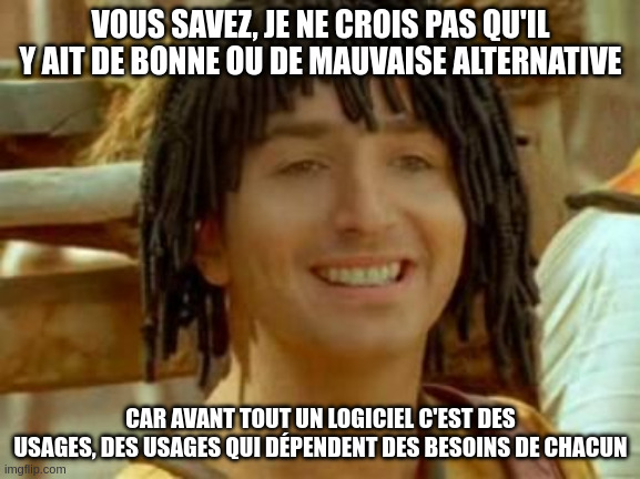 Et donc, suite à ça, diverses alternatives ont été mises en lumière un peu partout, à grands renforts de spam pour des outils parfois inadaptés pour un usage "Discord like" (oui Framasoft je pense à vous, j'y reviens plus tard), et donc l'utilisateur moyen sera sans doute un peu paumé face à cette avalanche de possibilités qui sont offertes, et donc je vais essayer de vous aider à y voir plus clair au niveau des diverses alternatives possibles.