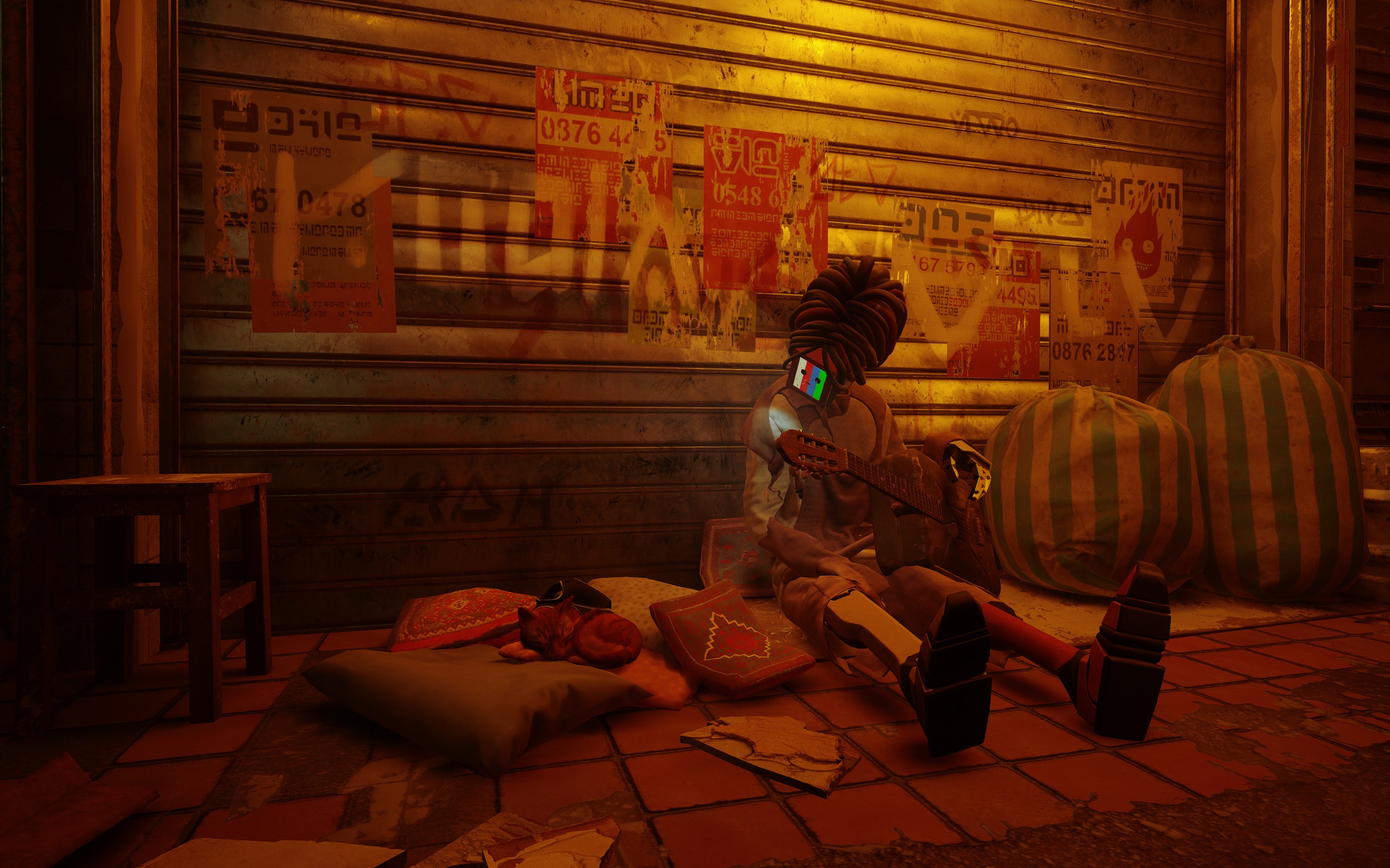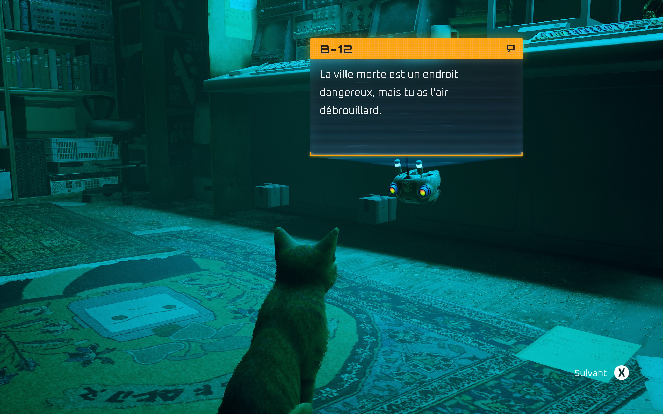 Vous alternerez donc entre phases d’explorations, petites énigmes à résoudre, souvenirs de B-12 à reformer grâce à des détails cachés dans le décor, et troc avec les robots (une partition de musique contre une canette de boisson énergisante ? C’est l’affaire du siècle !), pour sortir de ce merdier et retrouver votre famille chat (toute façon les humains ils sont morts).