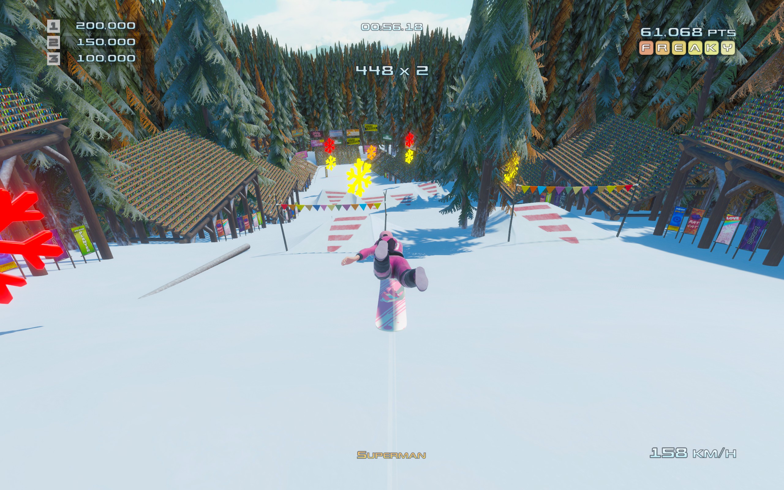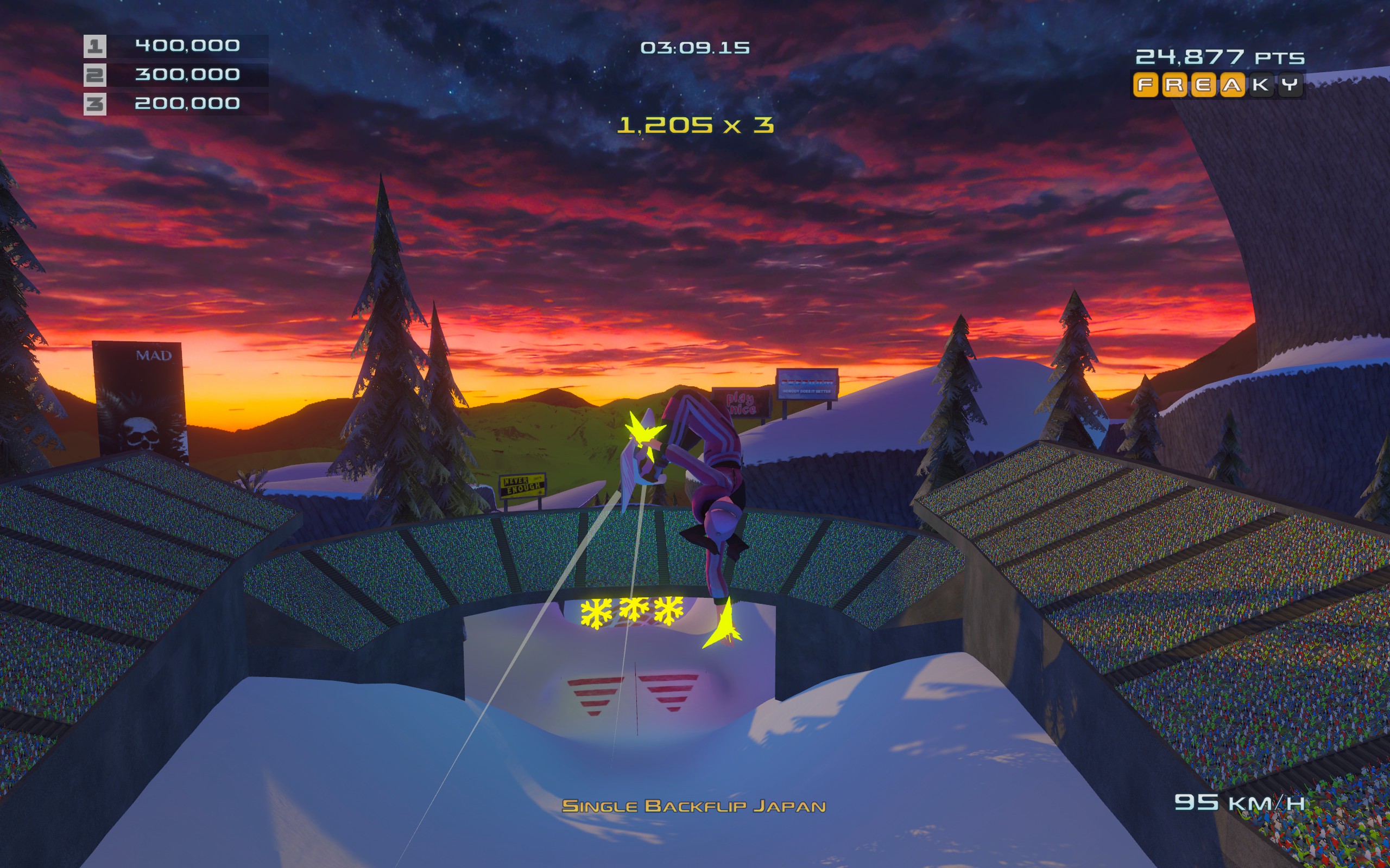 Visuellement, bah pareil, vous prenez les vieux SSX de la PS2, vous appliquez un petit lissage graphique, et zou vous avez Tricky Madness, le jeu reprend tous les codes visuels de son illustre modèle, y compris les Flocons volants en Freestyle pour grossir le multiplicateur, ou les bandes colorées sur les pistes pour indiquer les rampes de saut et les virages, tout comme à l’époque !
