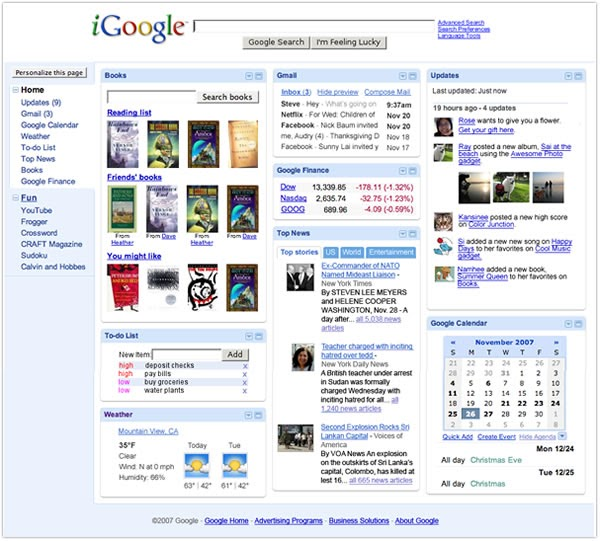 On y trouvait de tout, agrégateur de Flux RSS, prévisions météo, agenda, nos mails, Google Map, les updates de Google, et plein d'autres choses joutables via des Widgets, en plus de pouvoir customiser le visuel via des thèmes graphiques divers et variés.