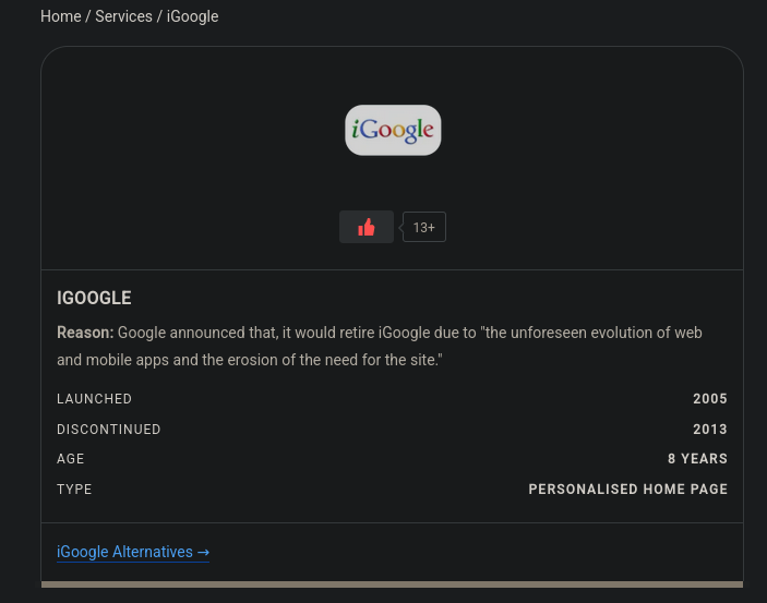 Bref, iGoogle était un service représentatif d'une époque où on pouvait encore pas mal customiser son expérience en ligne, où chez Google on disait "Don't be Evil", où les entreprises ne pronaient pas une "culture du vide" au nom de la sacro-sainte "protection contre la surcharge cognitive" qu'ils le veuillent ou non (et oui ya des gens comme moi qui peuvent gérer voire pour certains ont besoin d'en avoir car supportent pas le vide), bref une époque qui me manque.
